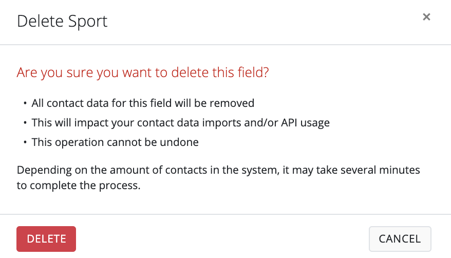 To delete a field, navigate to the Fields page and click the dots to the right of the name of the field. Select Delete from the drop-down list.