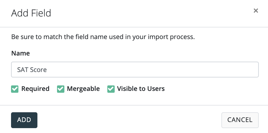 Clicking [ Add Field] will allow you to set up new fields that are allowed to be included in an import. You can also edit the names of existing fields (as long as you do not change the context of the data stored in the field).
