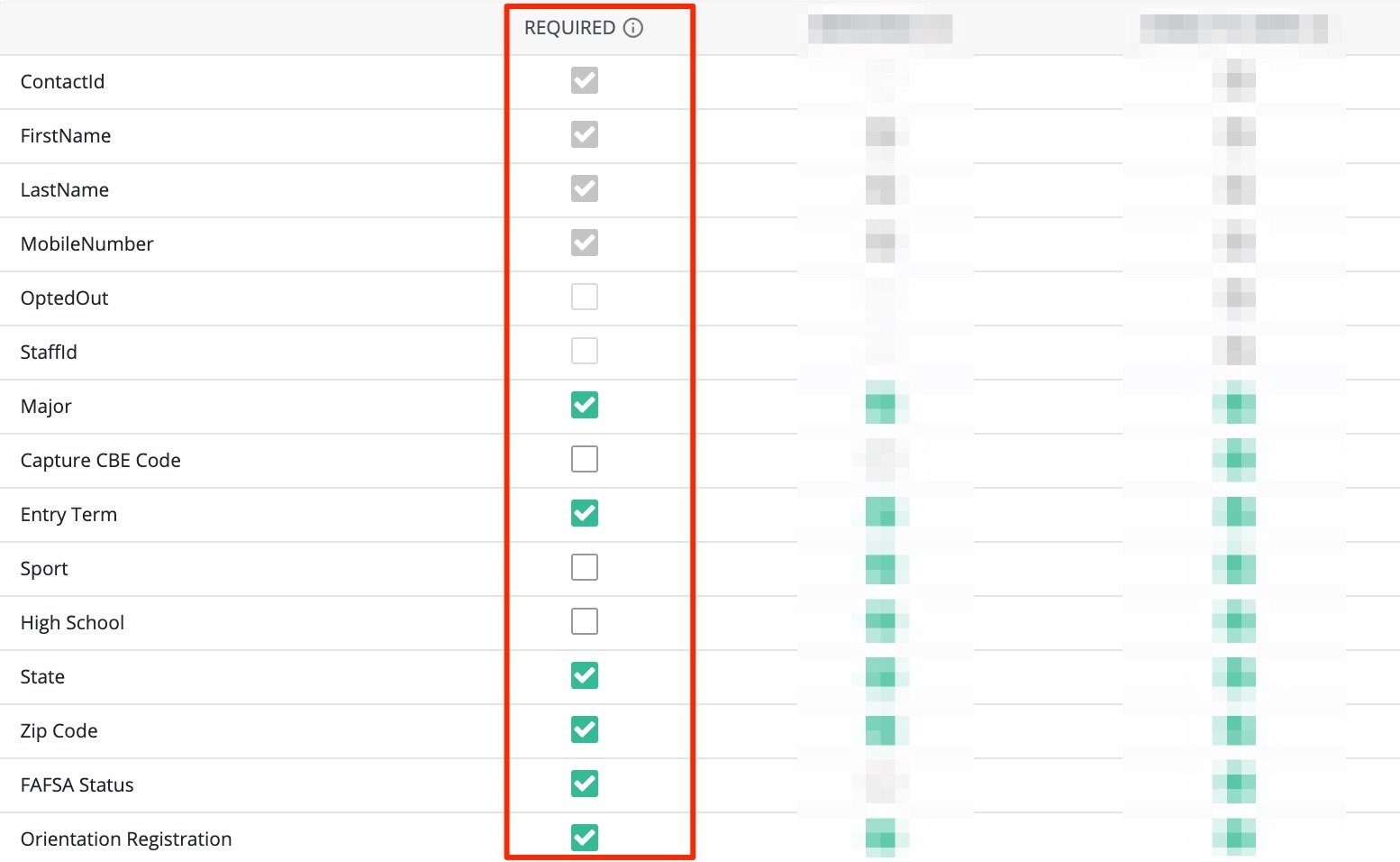 The check box in the Required column makes the field required on every import. Note that this requirement means the field must be present in the header row of every import--it does not mean that the field needs to actually contain data.