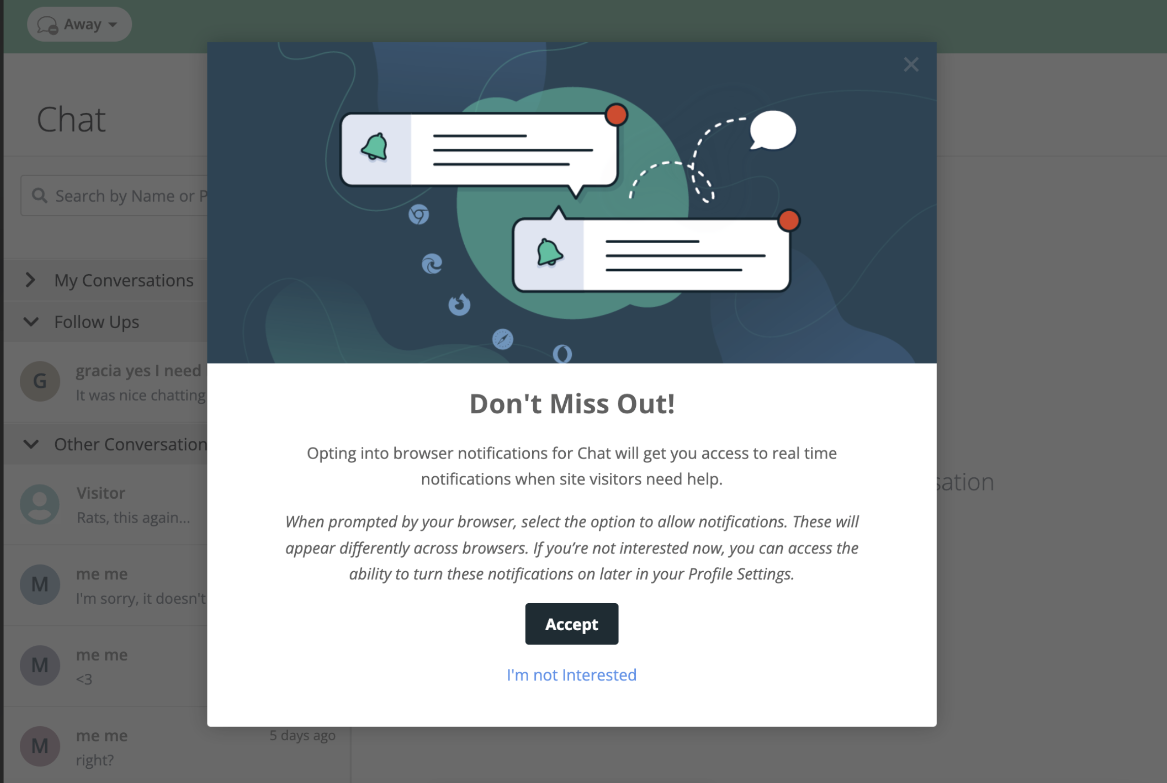 When accessing the Chat page on the left side navigation, users will receive a pop up that prompts them to enable browser notifications.