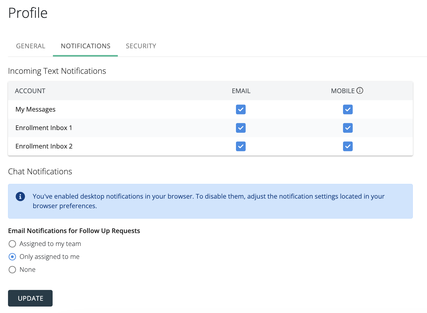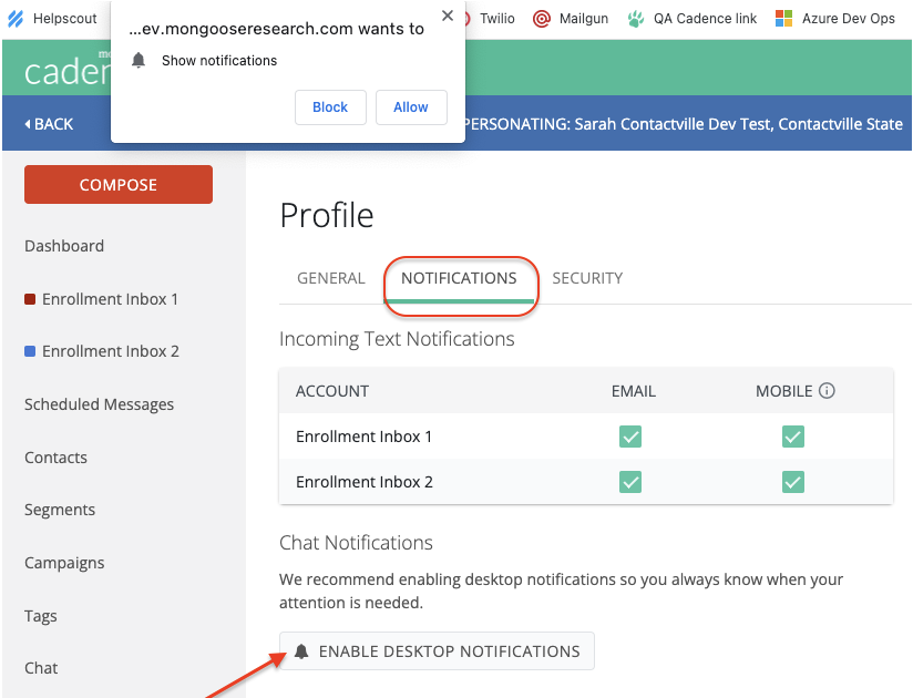 The Mongoose profile area provides Chat users the option to set up browser push notifications that will notify the user when an incoming chat has been assigned to them. Chat users have the option to set up browser push notifications that will notify the user when an incoming chat has been assigned to them and/or enable emails for when a new follow up conversation has come in.