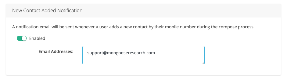 If your team is utilizing manually added contact notifications, Mongoose will send an email to the appropriate individual(s) when a contact is added to Mongoose. The email will indicate the name and mobile number of the contact, the name of the user who added the contact record, and the team the record was added to.