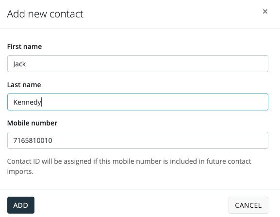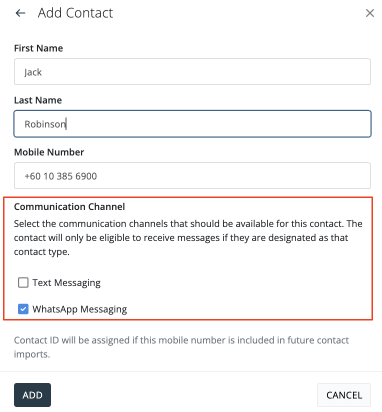 4. Click [ Add] to add the contact record to Mongoose. The contact will now be available to compose a text and/or WhatsApp message.