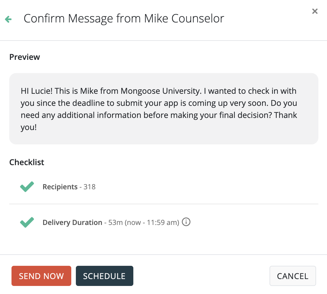 Sending messages to large segments of contacts should generally be planned in advance in order to ensure that incoming responses to the messages can be answered in a timely fashion, without overwhelming the user(s) that will be responding. We suggest sending "time sensitive" messages during a time when no other messages are scheduled to send.