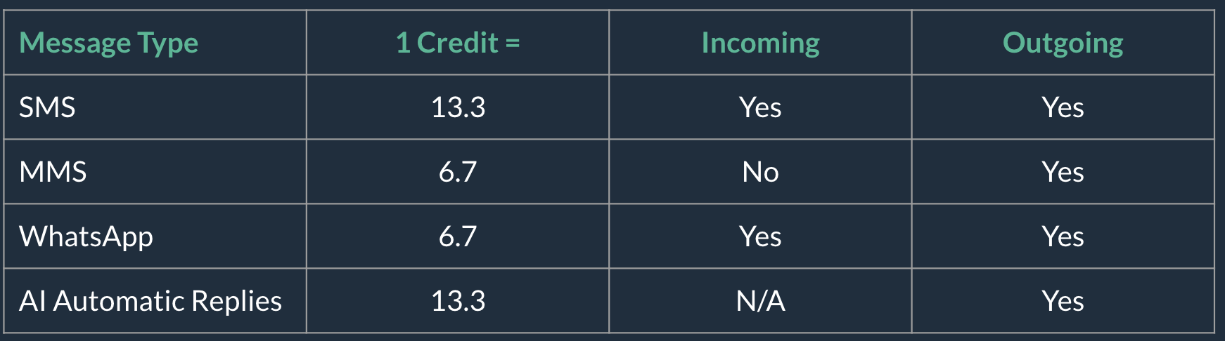This chart shows a breakdown of the message types, what one individual credit equates to, and if incoming/outgoing messages take away from the credit balance.