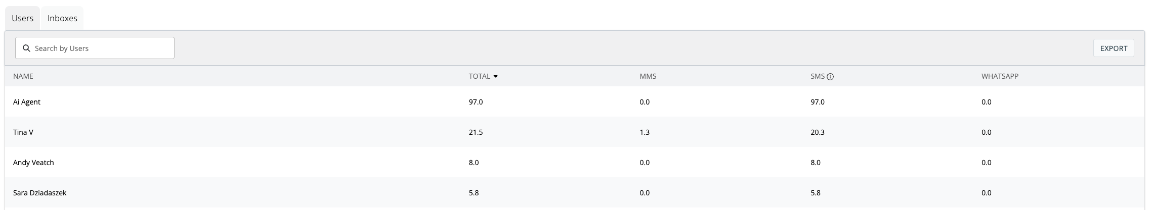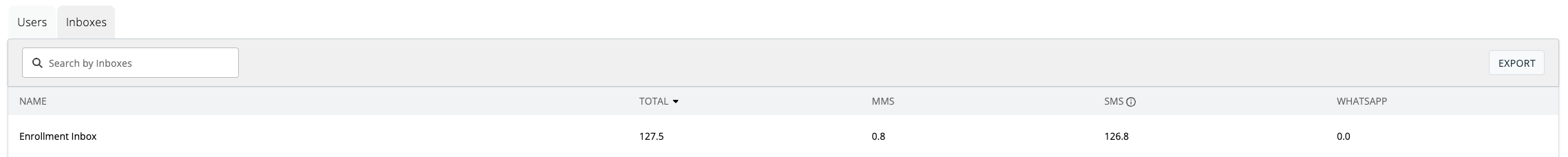 - Inboxes - With this view, you can see the total number of credits that each inbox used, as well as where the credits were used across the various messaging types (MMS, SMS, and WhatsApp).