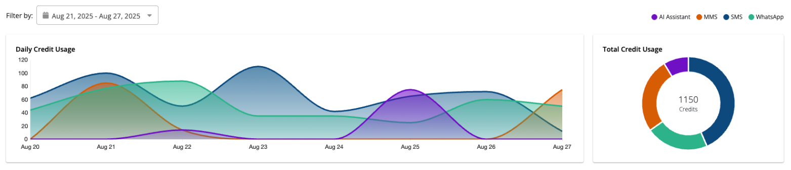 - Total Credit Usage - This displays where the credits were used across the various messaging types (AI Assistant, MMS, SMS, and WhatsApp). Use your cursor to hover over this chart to get additional insight.