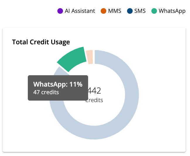 Hovering over the Total Credit Usage circle chart will display where the credits were used across the various messaging types (AI Assistant, MMS, SMS, and WhatsApp).