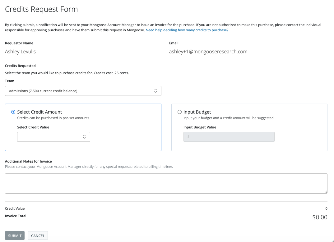 If your credit balance is running low and you need to purchase additional credits, you can easily do so within Mongoose. On the Credit Usage dashboard page, the + Add Credits button at the top right will bring you to the Credits Request Form: