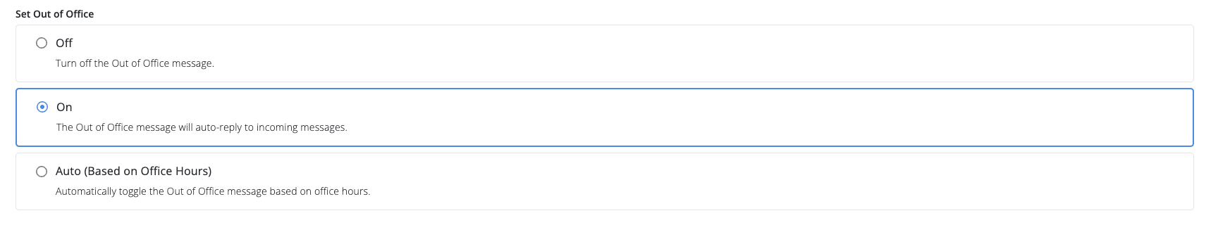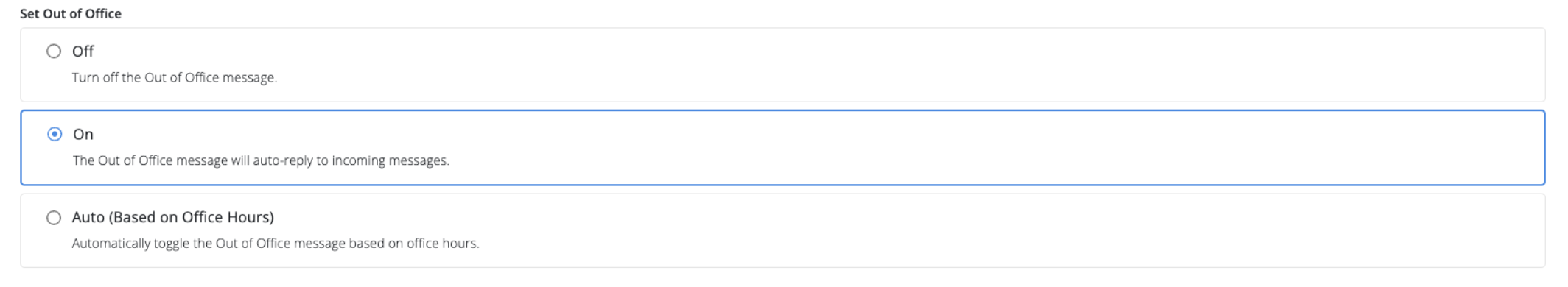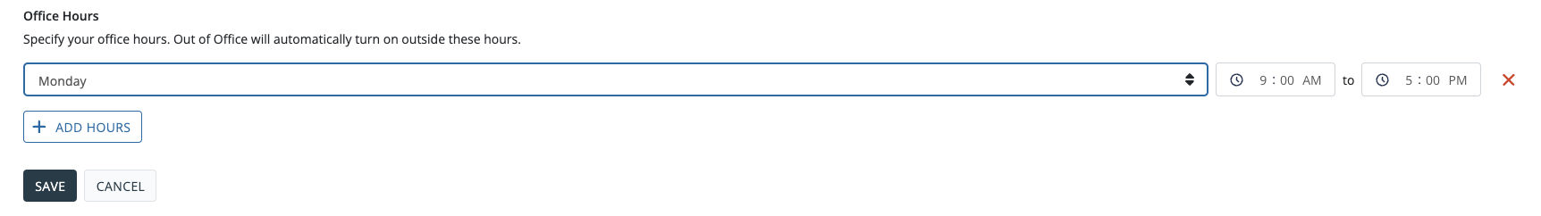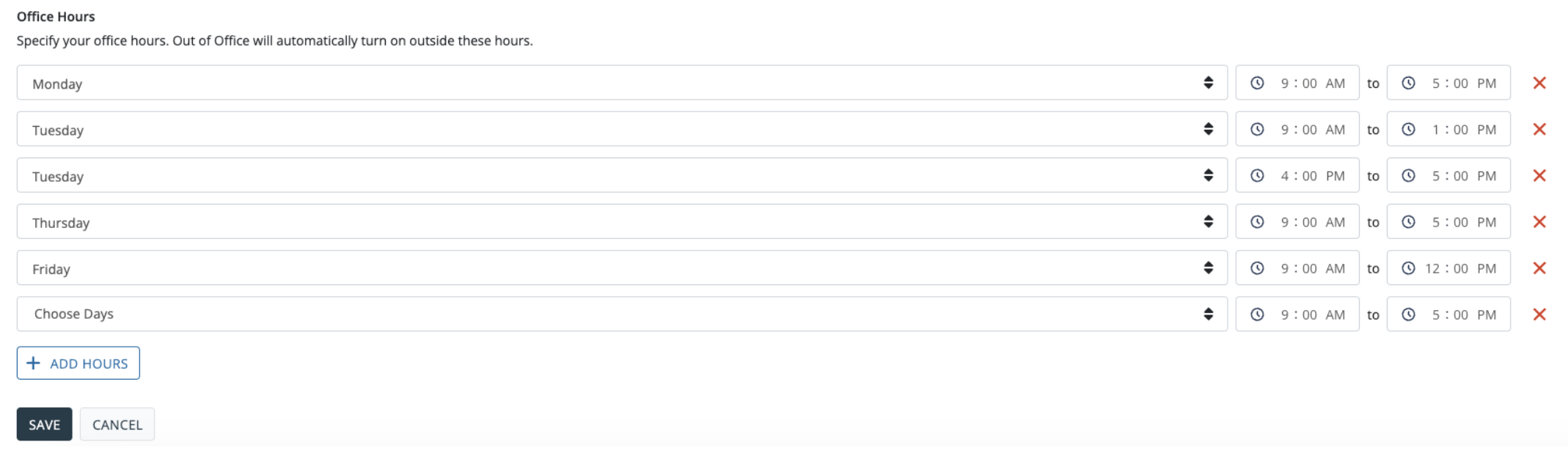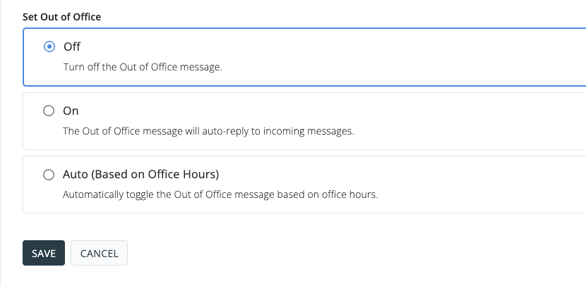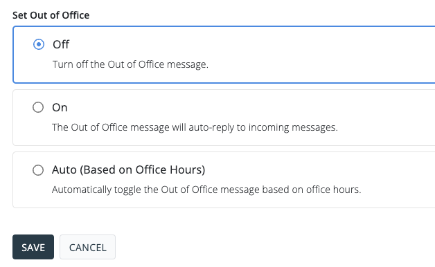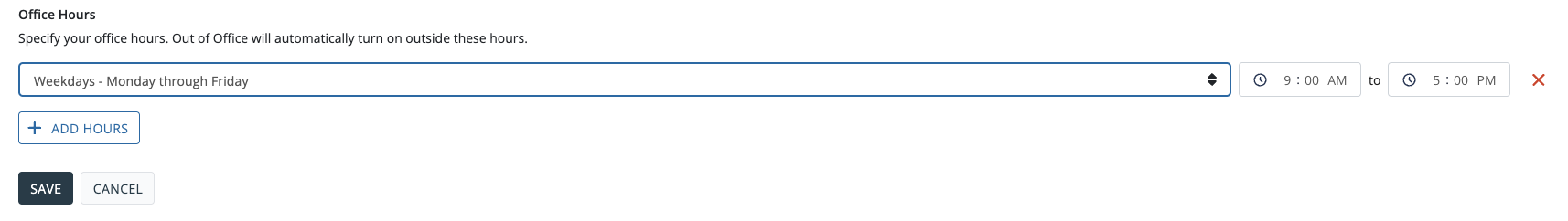NOTE: The Out of Office message will only send during times outside of your selected office hours. For example: If your team is available from 9am to 5pm, the out of office will be enabled after 5pm.