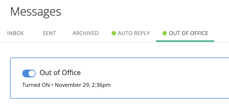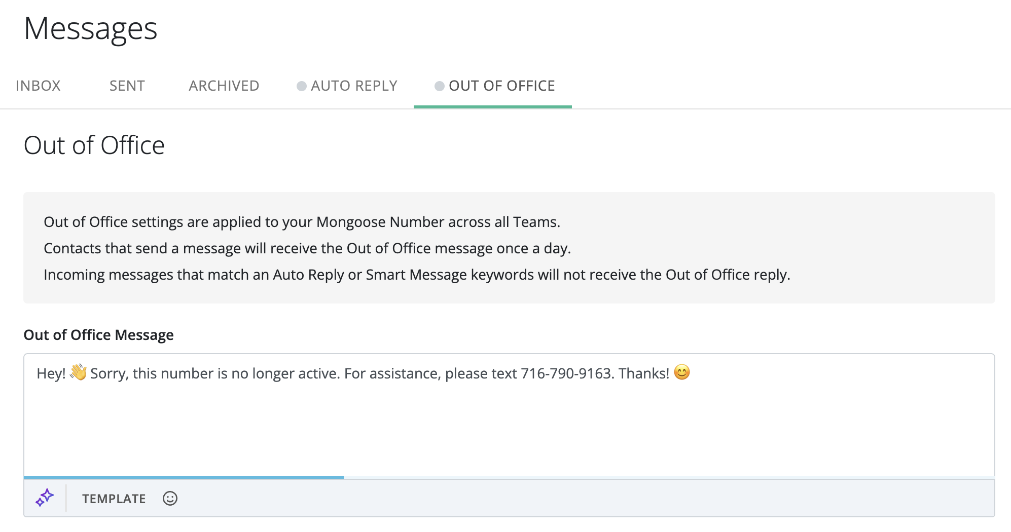 The Out of Office feature allows you to set an automatic response to go out if you receive incoming text messages to your personal Mongoose number and/or a Shared Inbox while you or your team are away.