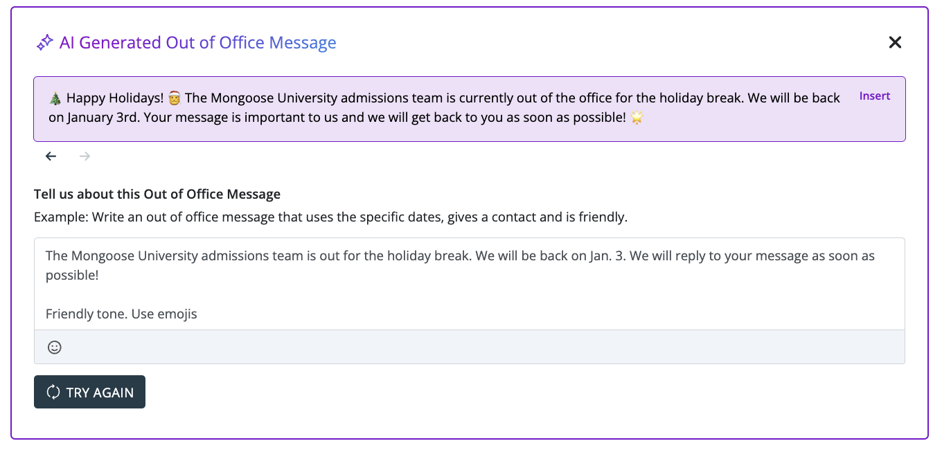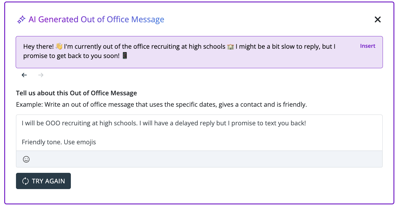 If you want a different message, click "Try Again" until you find one that you would like to use. Hover over the message and click "Insert" to use the message for your out of office response.