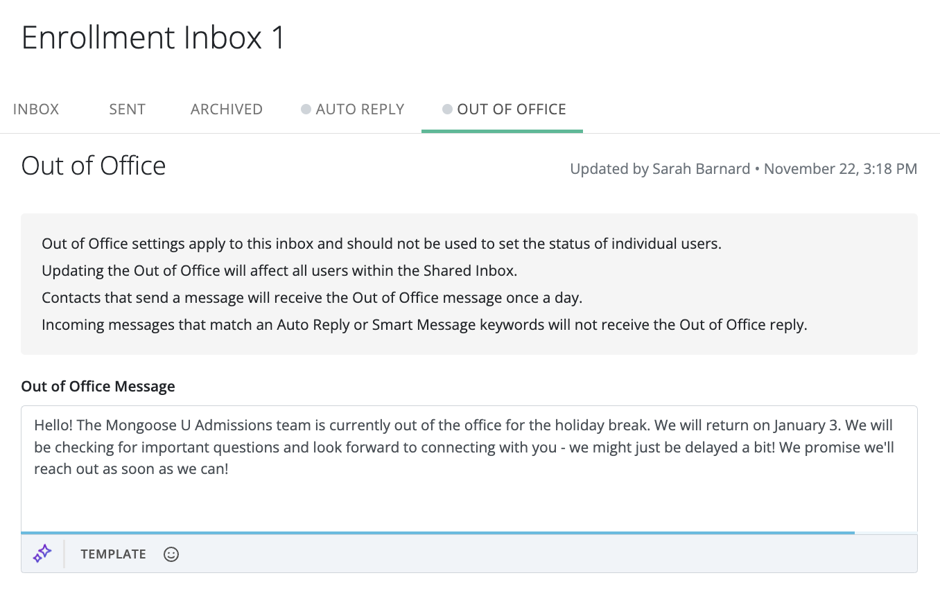 The Out of Office feature for Shared Inboxes displays which user turned it on or off and when. (Note: there is no timestamp for when the Out of Office message was updated.)