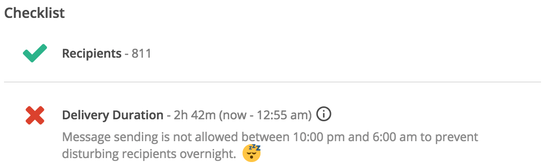 Sending messages to large segments of recipients often has a long delivery duration. If you are sending a message to a large segment of recipients in which the delivery duration falls into the 10pm-6am period, this message will not be able to be sent. In order to send this message, you will need to create a smaller segment or send it at a time in which the delivery duration doesn't reach 10pm.