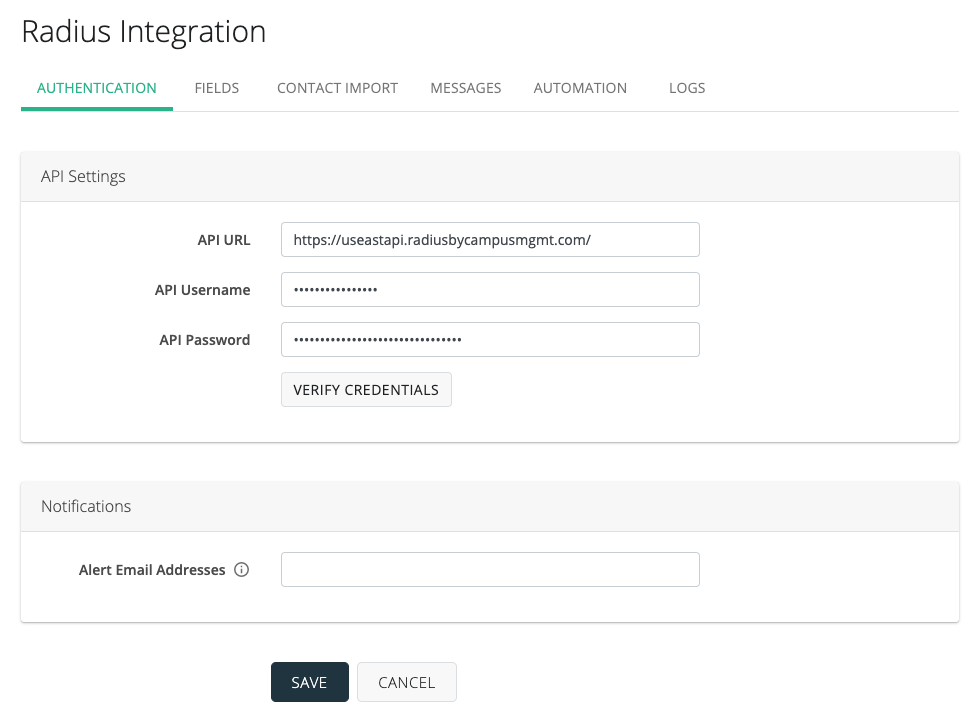 Enter in your Radius credentials, click [Save] and then click [Verify Credentials].