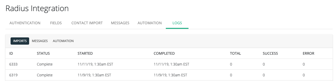 This page displays imports that have occurred within the last 15 days. Total number of records in the import, number of successfully imported records, and number of errors are all displayed. Clicking on the hyperlinked number in the Success or Error columns will generate a .CSV file showing specific records.