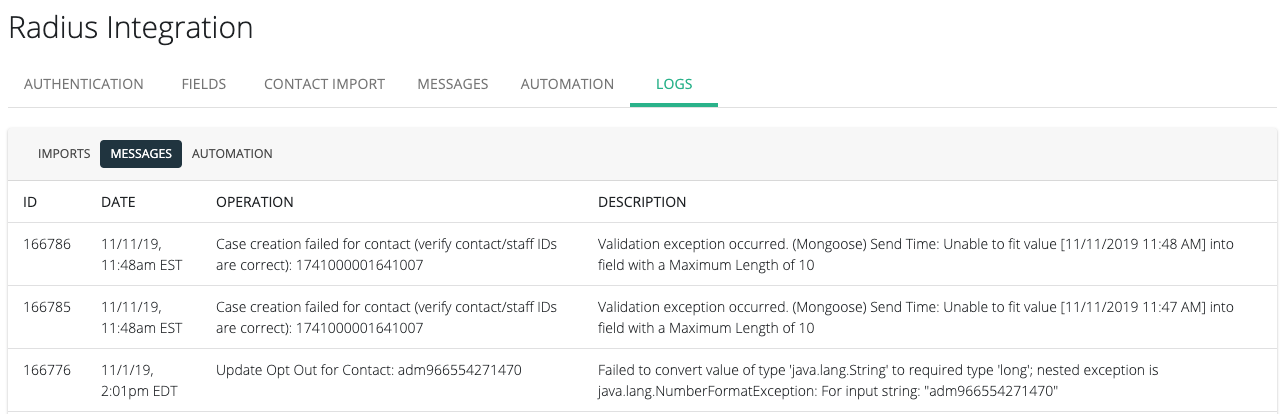 Errors related to Case/Case Message creation will be displayed under  Messages. Typical causes for these types of errors are inconsistencies with contact entity IDs or user entity IDs.