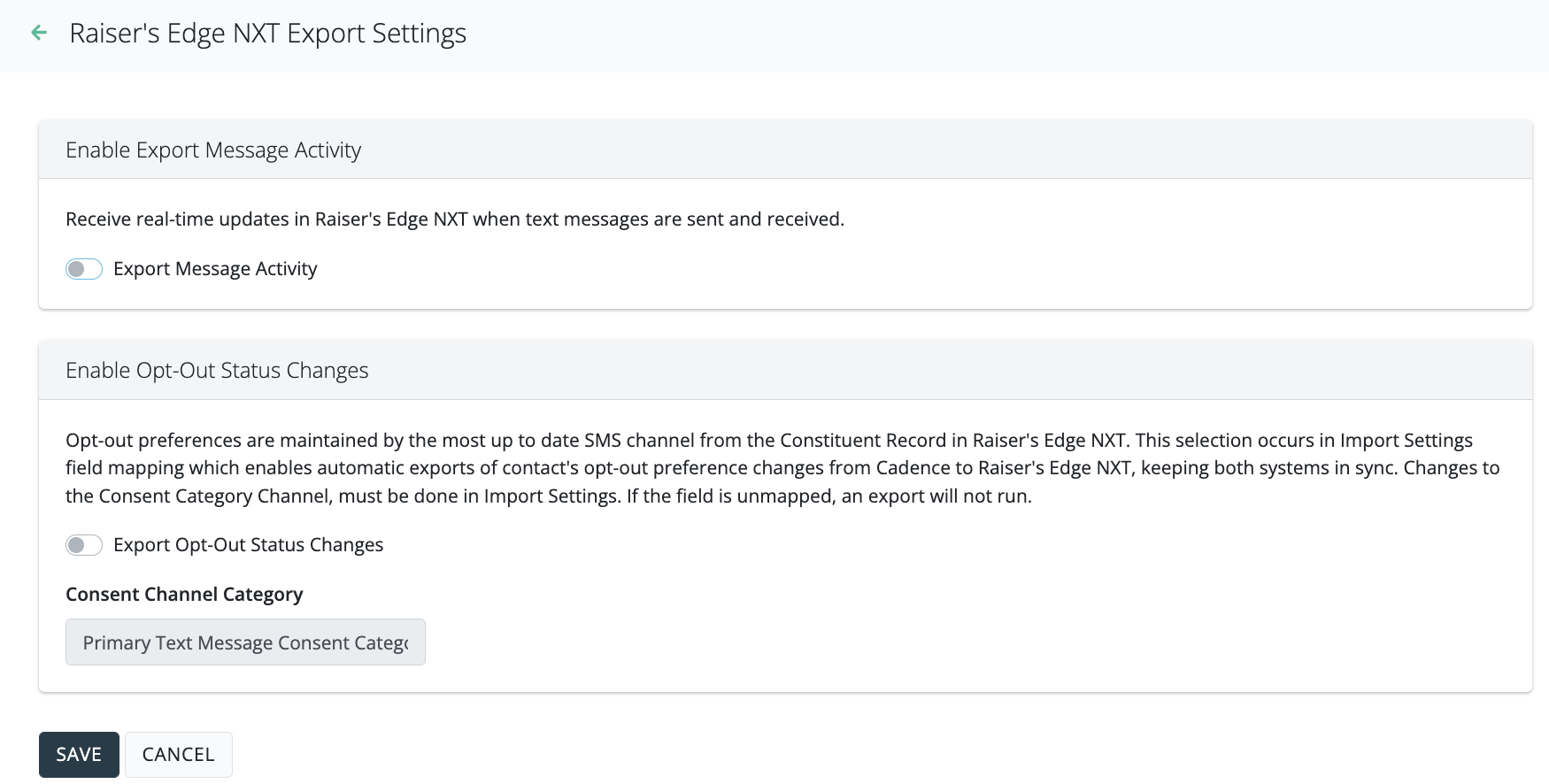 When configuring Exports, you can enable automatic exports to Raiser's Edge NXT for message activity and/or opt out changes. Exports will occur in real time.