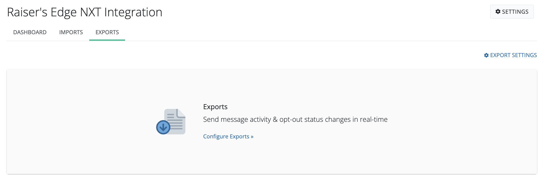 Exports is where you'll configure text message and opt out status change exports to Raiser's Edge NXT.