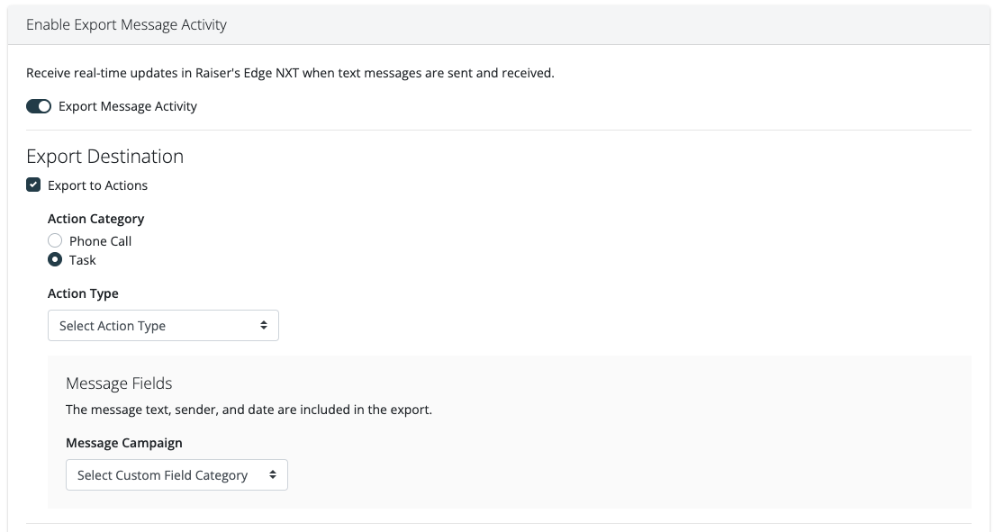 Use the toggle to enable the export for Message Activity. Message activity can be sent as "Actions" and/or "Notes" within Raiser's Edge NXT.