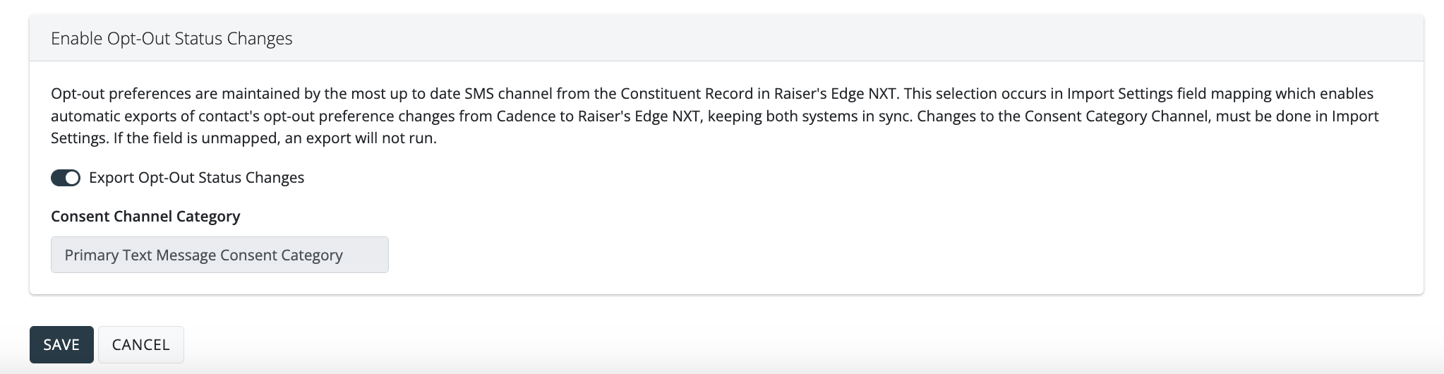 If Opt-Out status changes is enabled, Mongoose will update Raiser's Edge NXT with any changes in opt out status that occur in real-time. Mongoose will update the selected "Consent Channel Category" based on the field mapping for opt out preference on imports.