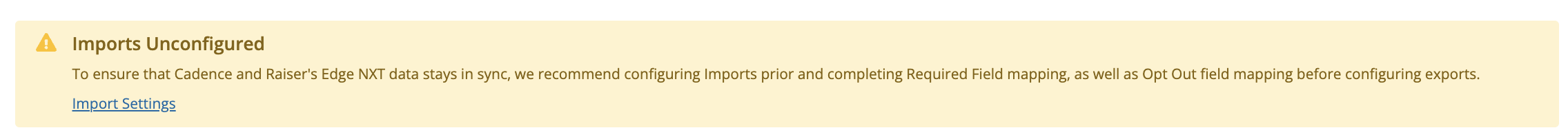 Note: Imports must be configured before Exports. A notification will prompt you to complete configuring Imports if Exports are attempted first.