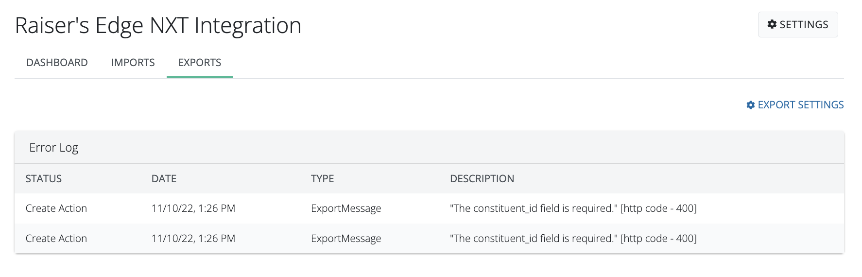 The Exports tab provides a designated Error Log tracking area should Mongoose encounter any issues when exporting message activity back to Raiser's Edge NXT.