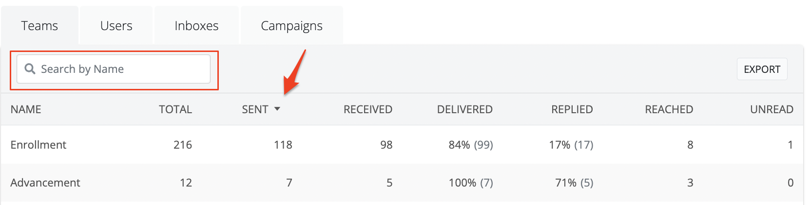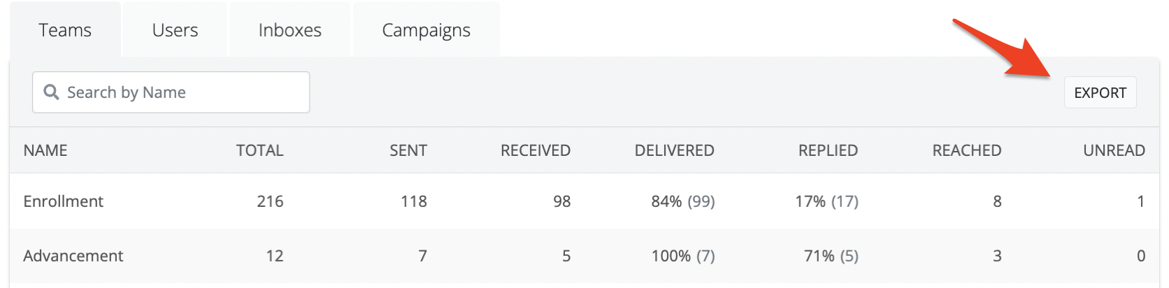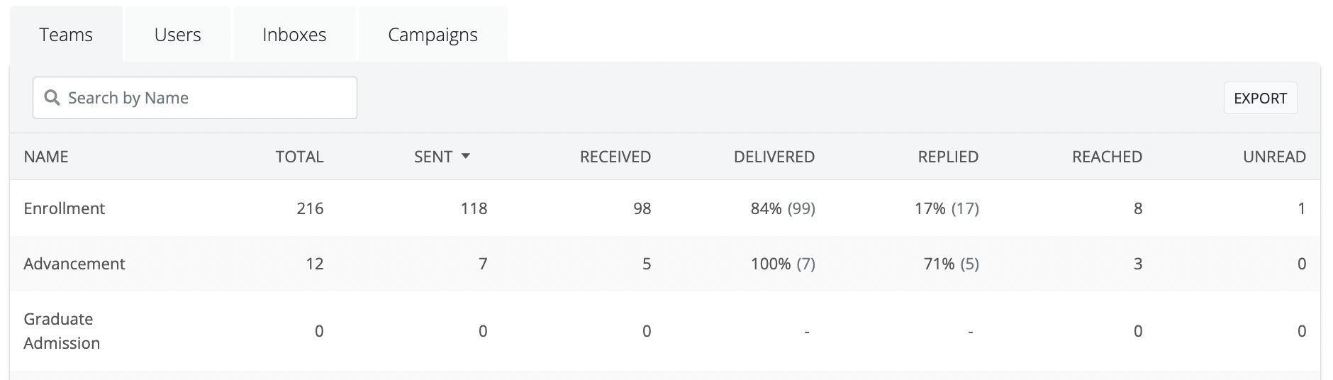 The Teams tab will provide a usage breakdown of the Total, Sent, Received, Delivered, Replied, Reached, and Unread messages per Team selected.