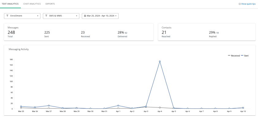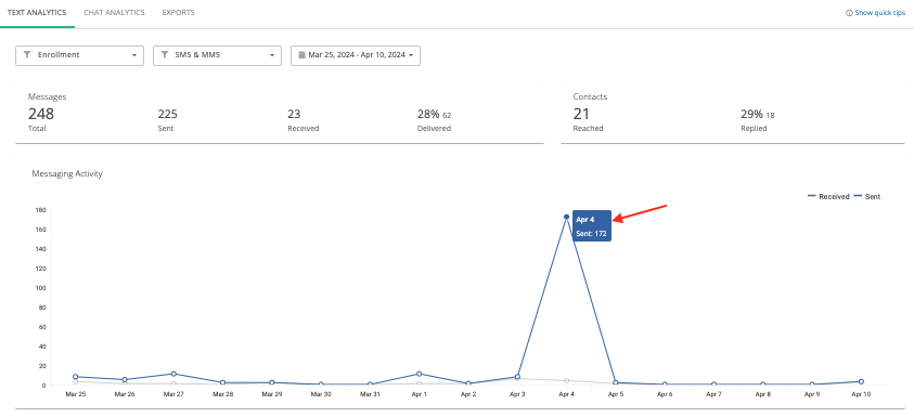 - Filter by Message Type(s): Drill to see specific message type analytics. Options are SMS, MMS, or both. Both is the default.