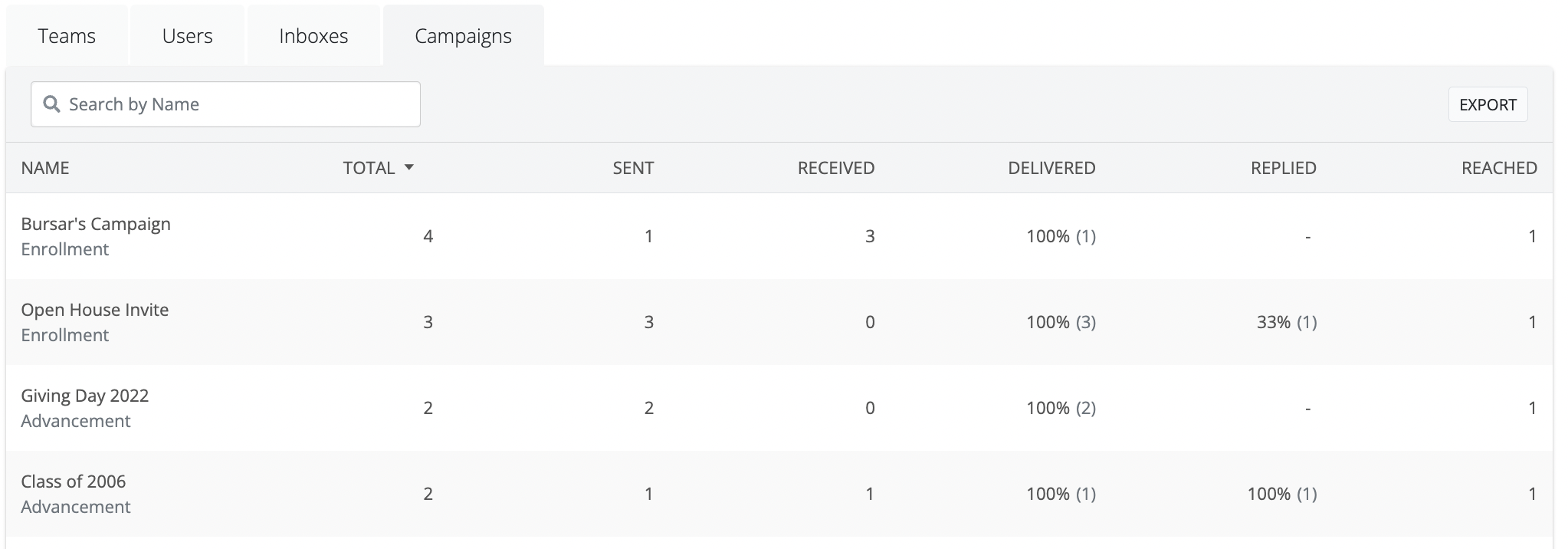 The Campaign tab provides a breakdown of the Total, Sent, Received, Delivered, Replied, Reached, and Unread messages per Campaigns on your selected team(s).