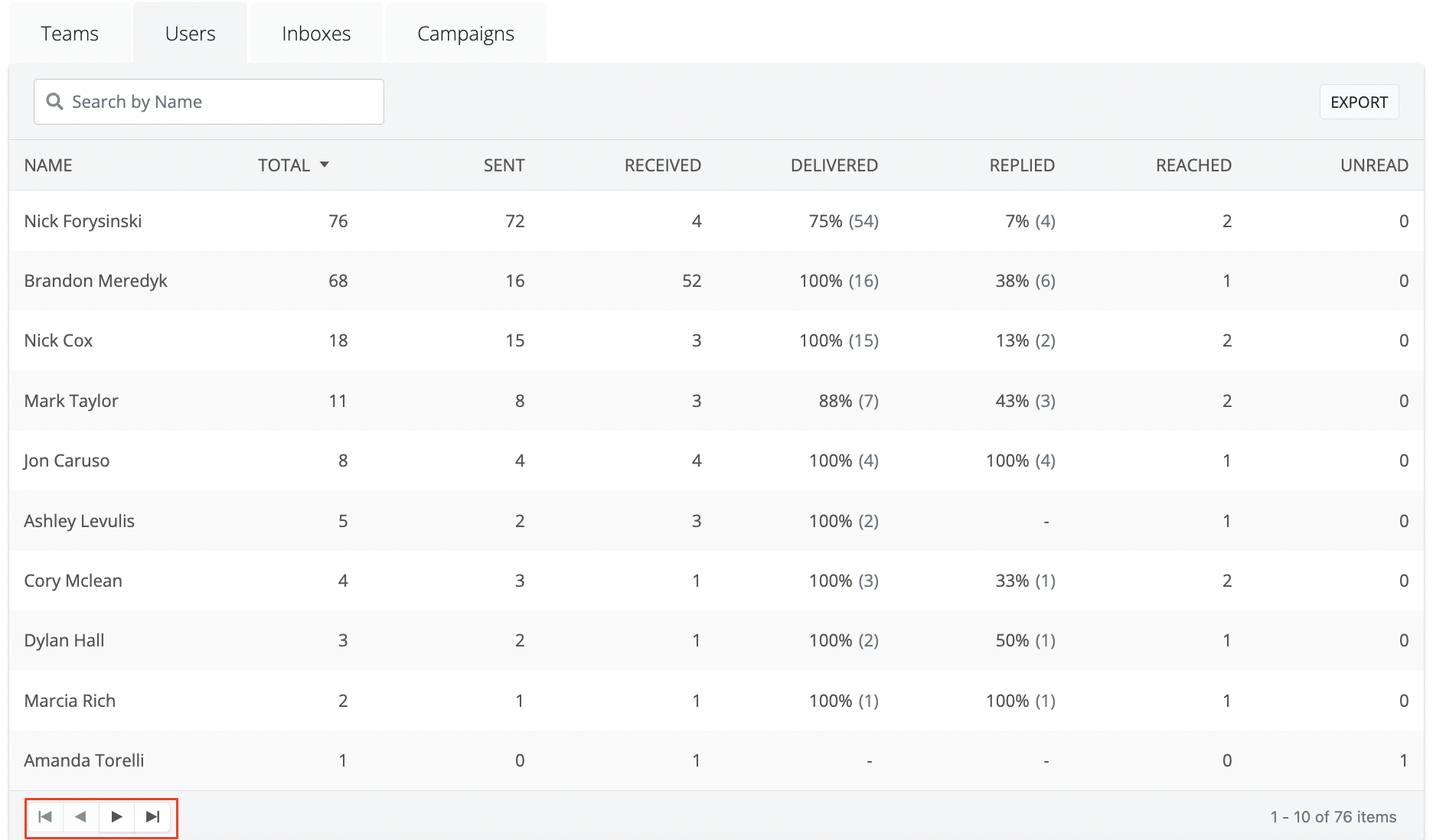Each team selected using the filter will be listed with corresponding data. If a team has no activity, it will still show up in the breakdown if you included it in your filter. This provides an easy way to identify which teams are not utilizing Mongoose and offers an opportunity for strategizing how text messaging could be best utilized by those teams.