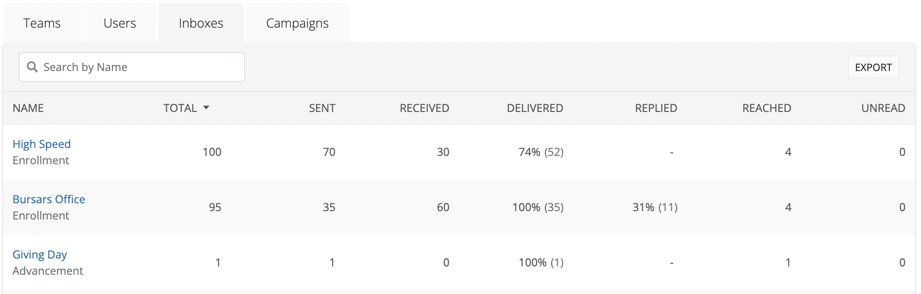 The Inboxes tab provides a breakdown of the Total, Sent, Received, Delivered, Replied, Reached, and Unread messages per Shared Inbox and/or High Speed Inbox on your selected team(s).