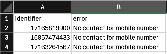 - "Invalid mobile number": Occurs when you have included a number that is not 10-digits long (or not 11-digits long if it begins with a "1").