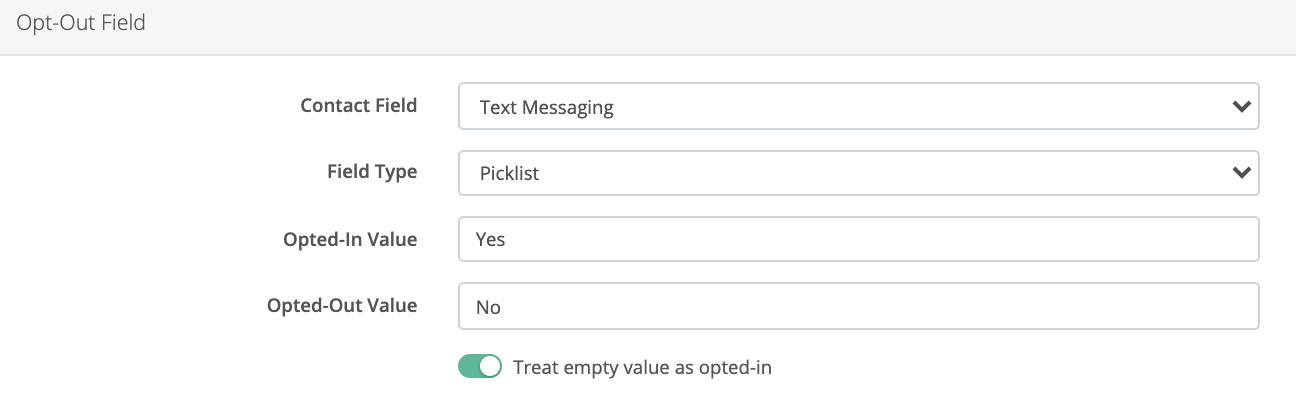 - Set the Opted-In Value to the option in the picklist that indicates a record is opted-in.
