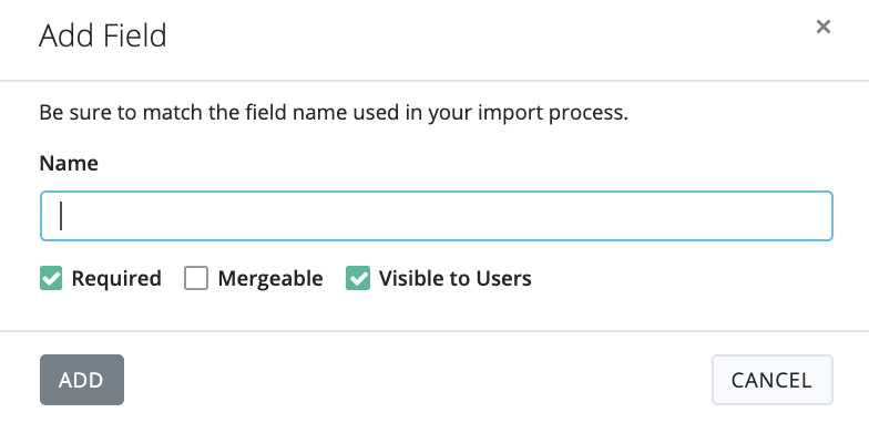 The standard set of Mongoose fields will be available and preset with the Required, Mergeable, and Visible to Users (can be seen in Mongoose on the record by all users in the department/team). These cannot be changed or removed. You may elect to add an additional field by clicking [Add Field] and specifying the options.