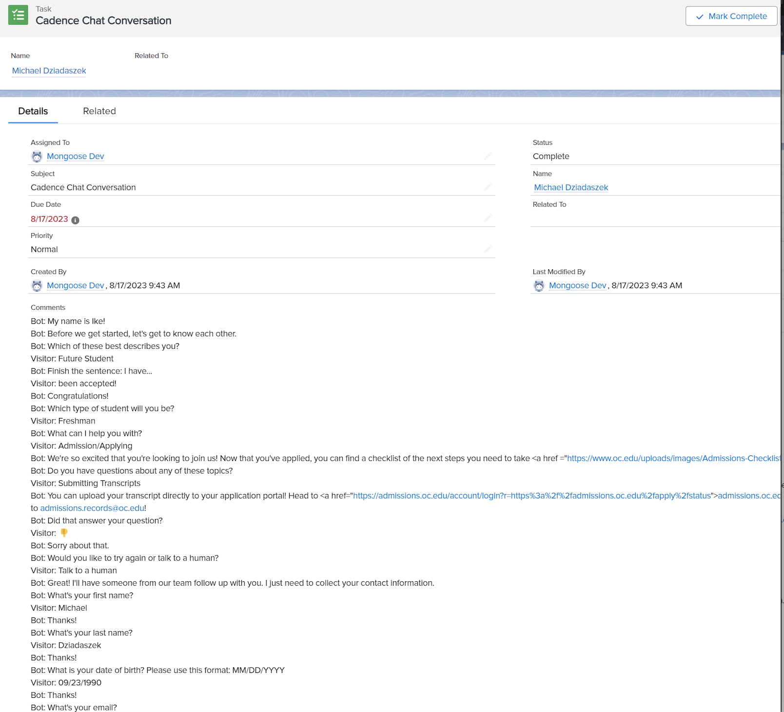 A Task containing the Chat Conversation transcript is then associated with that entity.