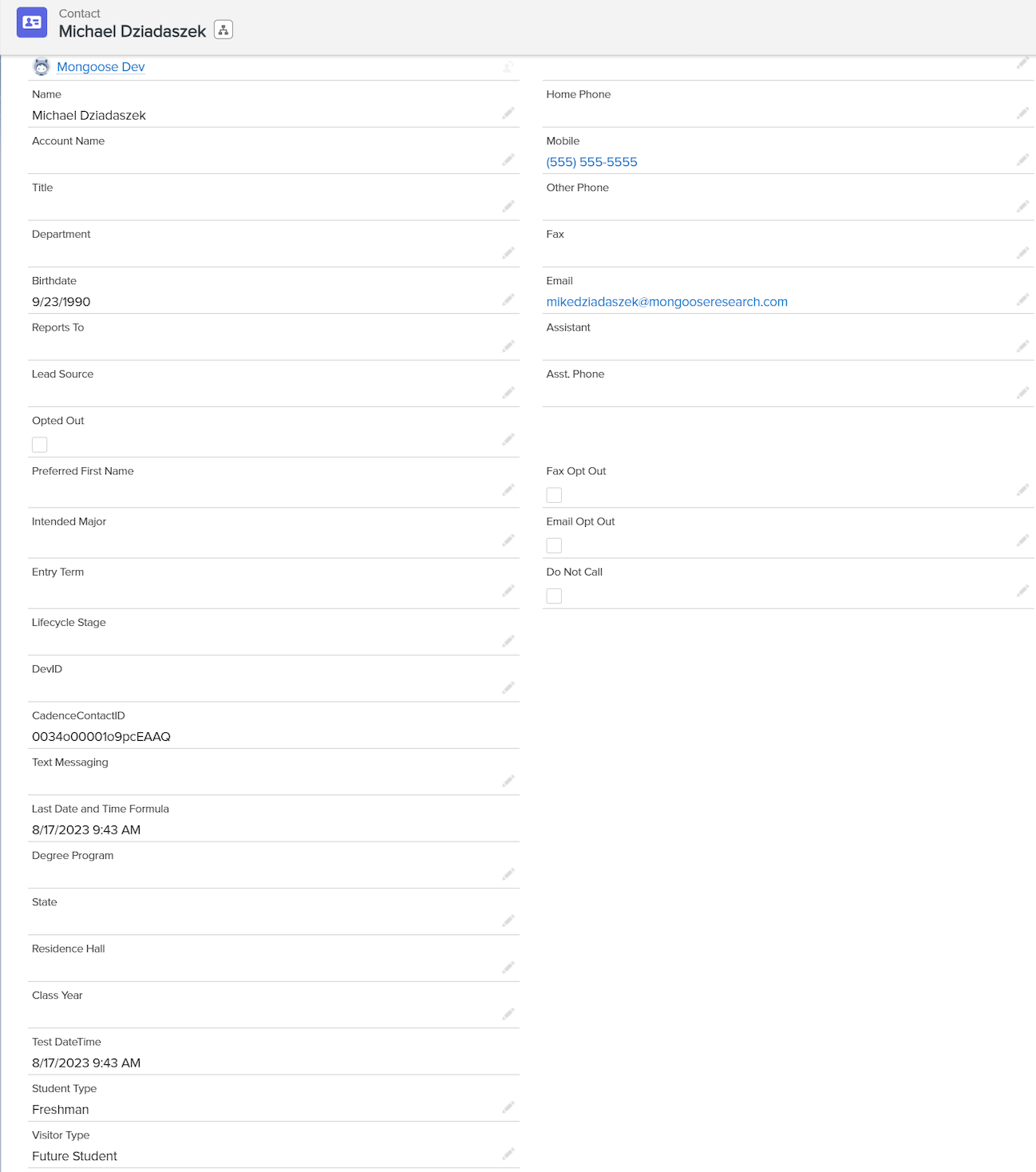 Note: By default Salesforce requires First Name, Last Name and Email Address to be able to create a contact record. Export filters can be set up on Mongoose side if you require additional criteria for Salesforce to create the record. For example: within a conversation, if Student Type = Future Student, then send conversation to Salesforce. This is particularly helpful if not all conversations should be sent to or created in Salesforce.