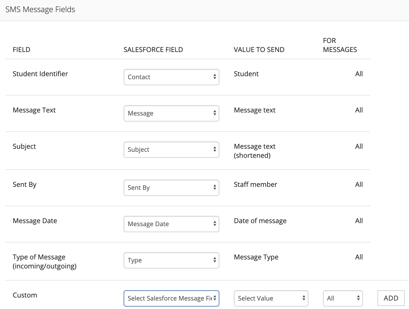 For any custom message fields, you can select the Salesforce Field, a value, and if that field should only be included on incoming, outgoing, or all. For example, if you select Incoming, the custom value will only be sent on incoming messages and not on outgoing messages.