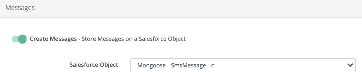 Start by enabling Create Messages and selecting the Salesforce Object. Any object which is associated to Contact or Lead will appear in this list. We recommend creating a new custom object for storing SMS message history. Existing Salesforce objects may not successfully support the information we will send over and they also may not meet our requirements. Also, it keeps the Mongoose information separate from other apps or services that may be writing information into an existing object.