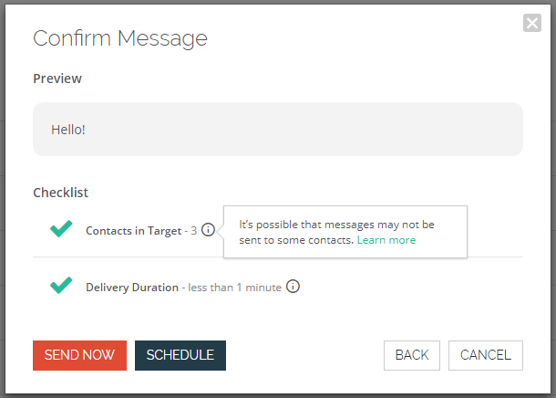 - If a contact exists in the target, but not in Mongoose, they will be skipped and not receive the message.