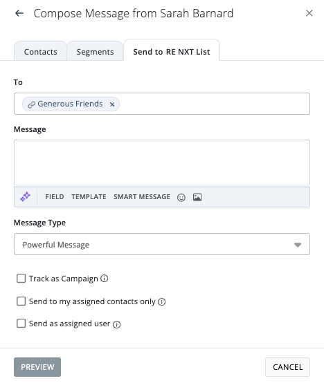If you are in a team within Mongoose that is integrated with Raiser's Edge, you will find a tab for RE NXT Lists when composing a message: