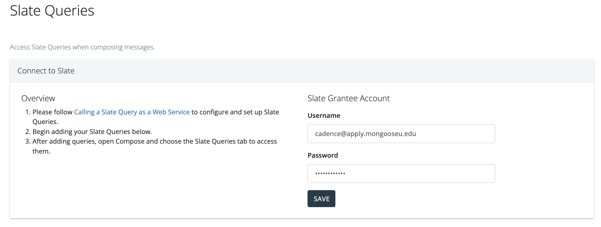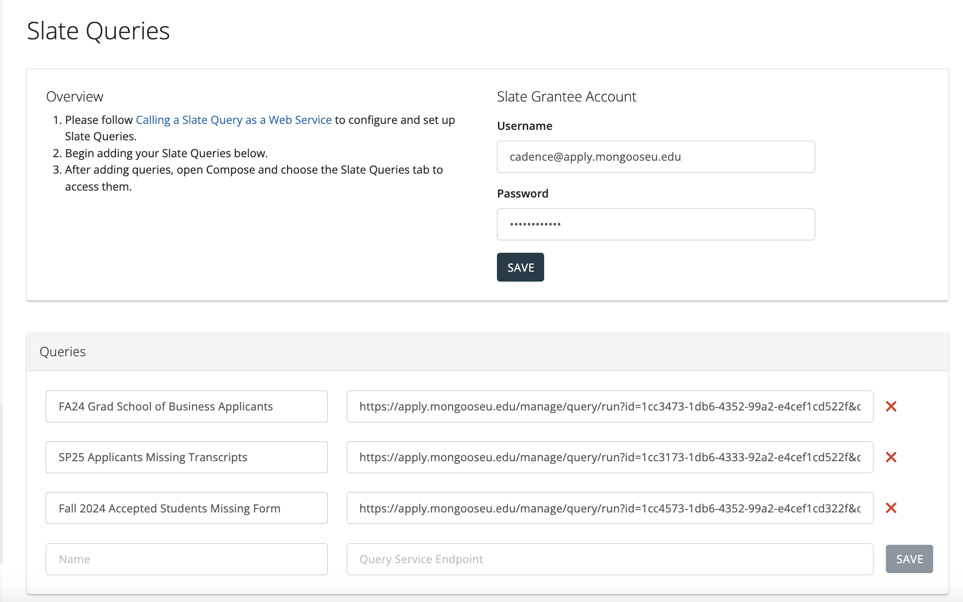 Mongoose utilizes the Slate web services to be able to connect to your Slate queries. This process is slightly different than how the Slate integration is connected for bringing contact data in from Slate as that utilizes the Slate SFTP. Authentication is required for web services so for that reason, you'll see a separate configuration area called "Slate Queries" within your team drop down specific to setting up this feature. This area will need to be configured before your Slate queries show up within the "Compose" modal.