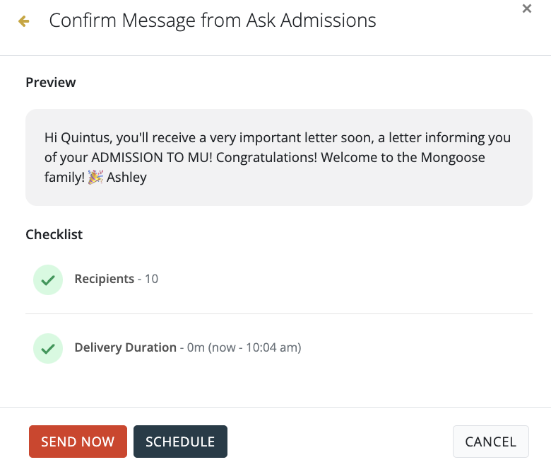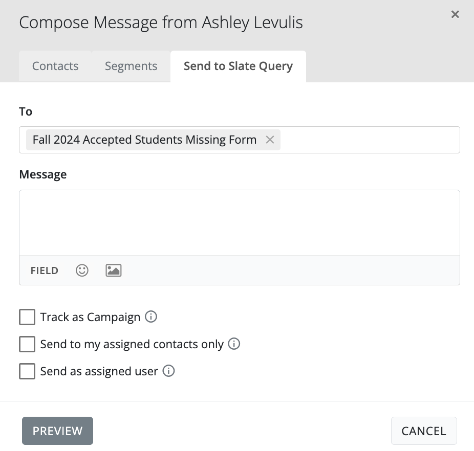 - If scheduling a message for a future date with the “Send to Slate Query” feature, please be aware that the message will send to contacts in the Query based at the time the message goes to send.