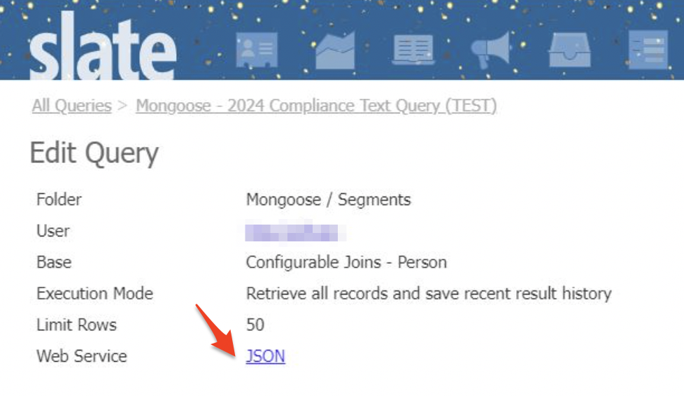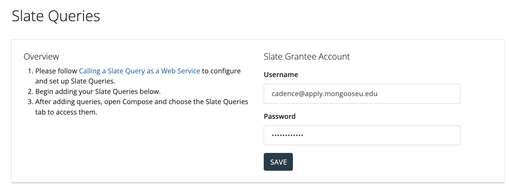 The overview section will provide a link to Slate documentation providing information on how to make sure your Slate Query is accessible via web services. Part of this process will require you to "Add Grantee" to the query for Mongoose to access it. A username and password will be created during this process and this is the username and password required for us to authenticate.