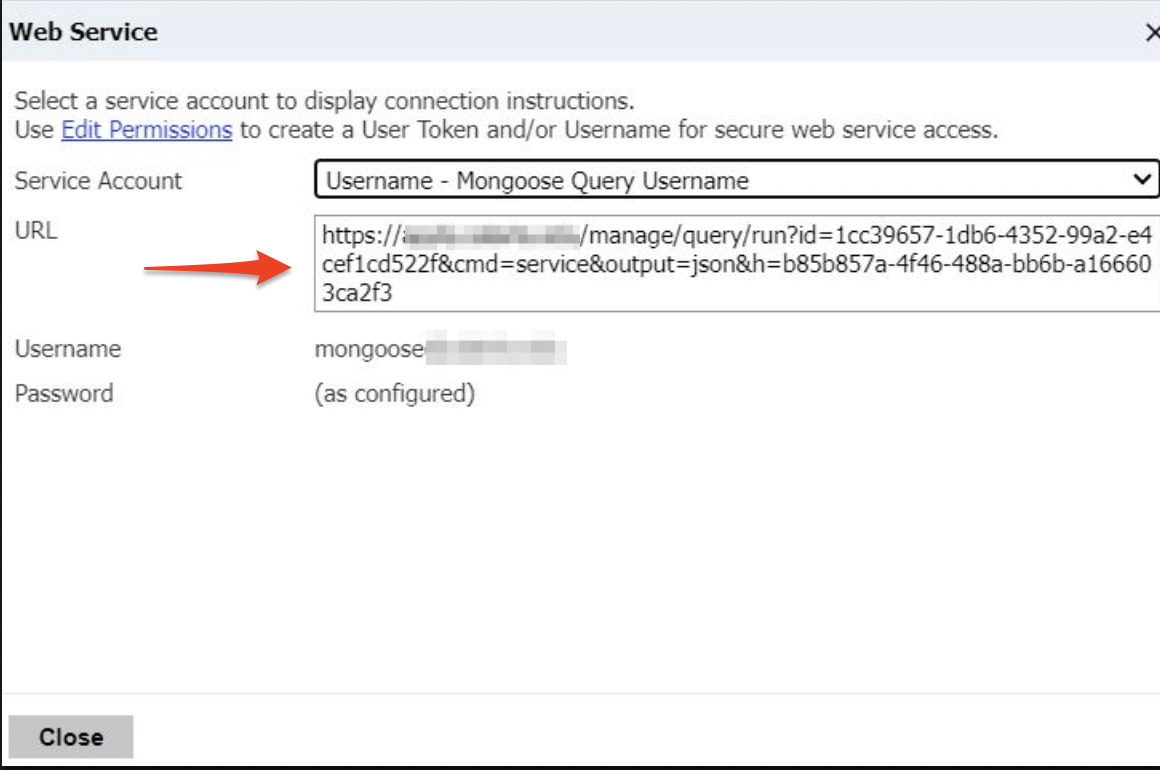Select the service account to see the URL for your Query. Copy and paste this URL into Mongoose.