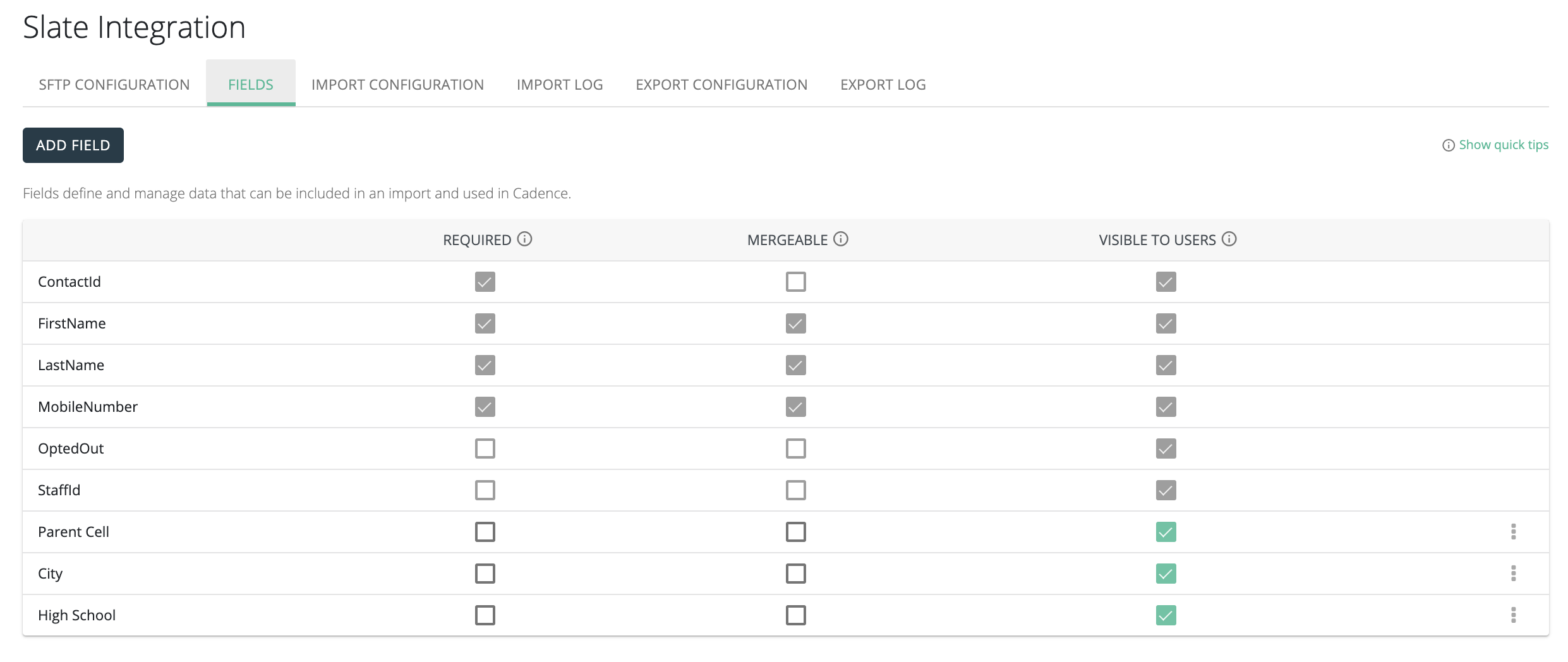 In order to successfully import data from fields in your Slate file, corresponding fields must be set up in Mongoose. The purpose of configuring fields in Mongoose is to specify how the fields should be named in the platform and to set permissions.