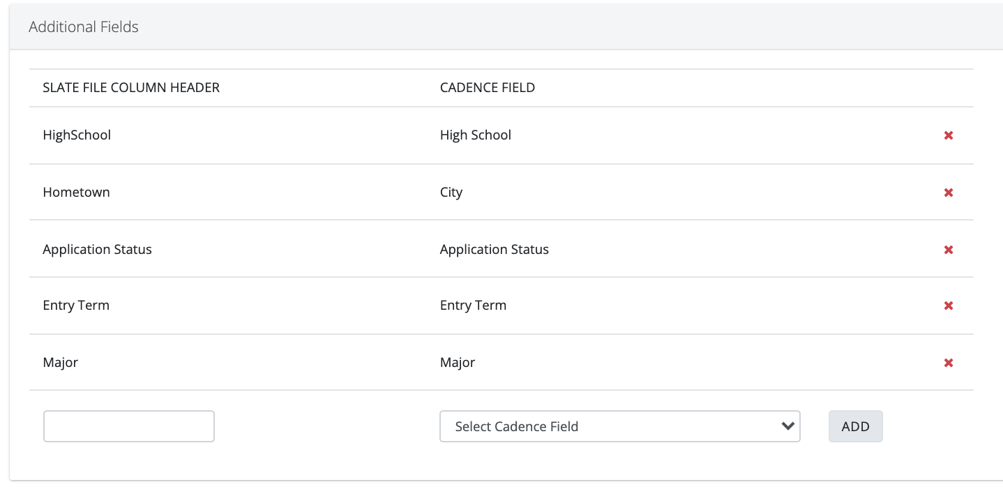 If the file from Slate contains additional columns, they can be configured to load into custom fields within Mongoose. The exact column header from the Slate file is specified along with selecting the custom field from Mongoose (which must be set up prior to this step).