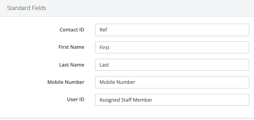 If you wish to assign contacts to users, a field containing the identifier for their assigned user should be included. An opt in/out preference for texting can be included as well. Additionally, all other fields that you wish to load as custom fields within Mongoose should be included.