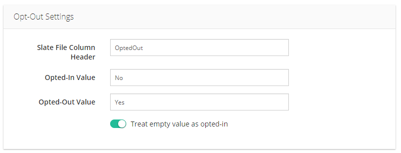 If the file from Slate contains a column with each contact's opt out preference, it can be configured here. Along with the exact column header, the values that indicate opt in vs opt out must be specified, as well as what a blank value represents. The specified values must match what is shown in the file from Slate. If this section is skipped, all contacts in the file will be assumed to be opted in for texting.
