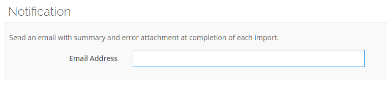 Notifications - An email address can be specified to receive an email at the completion of every import job, containing details on the success/error counts.